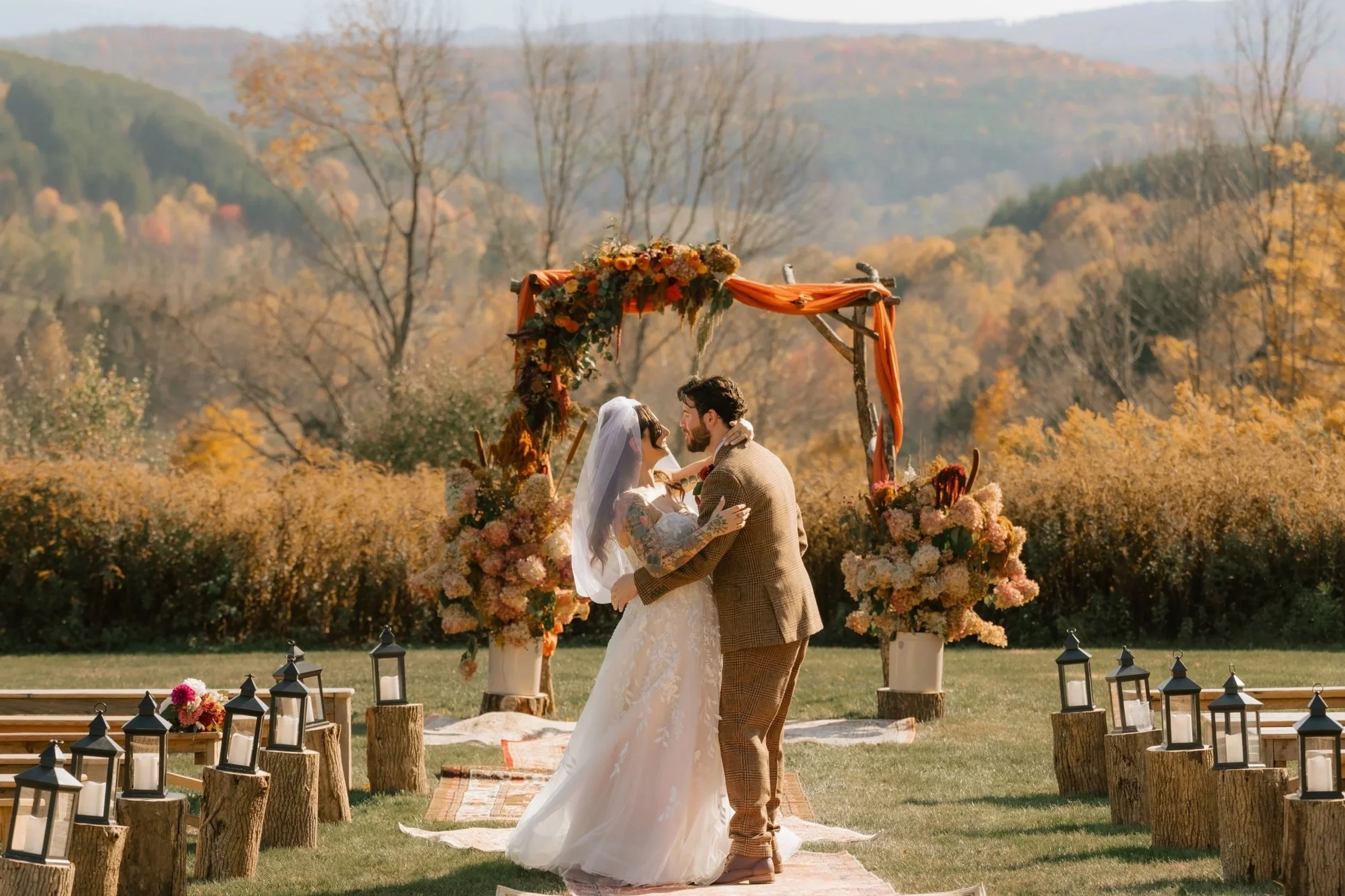 Guests arrived to the hilltop ceremony site as the afternoon light settled in. With the Catskills as their backdrop and music drifting through the air, Amanda and Dalton exchanged vows officiated by the friend who had been there for so many chapters of their story. It was heartfelt, personal, and filled with the kind of laughter and tears that only come from deep connection.