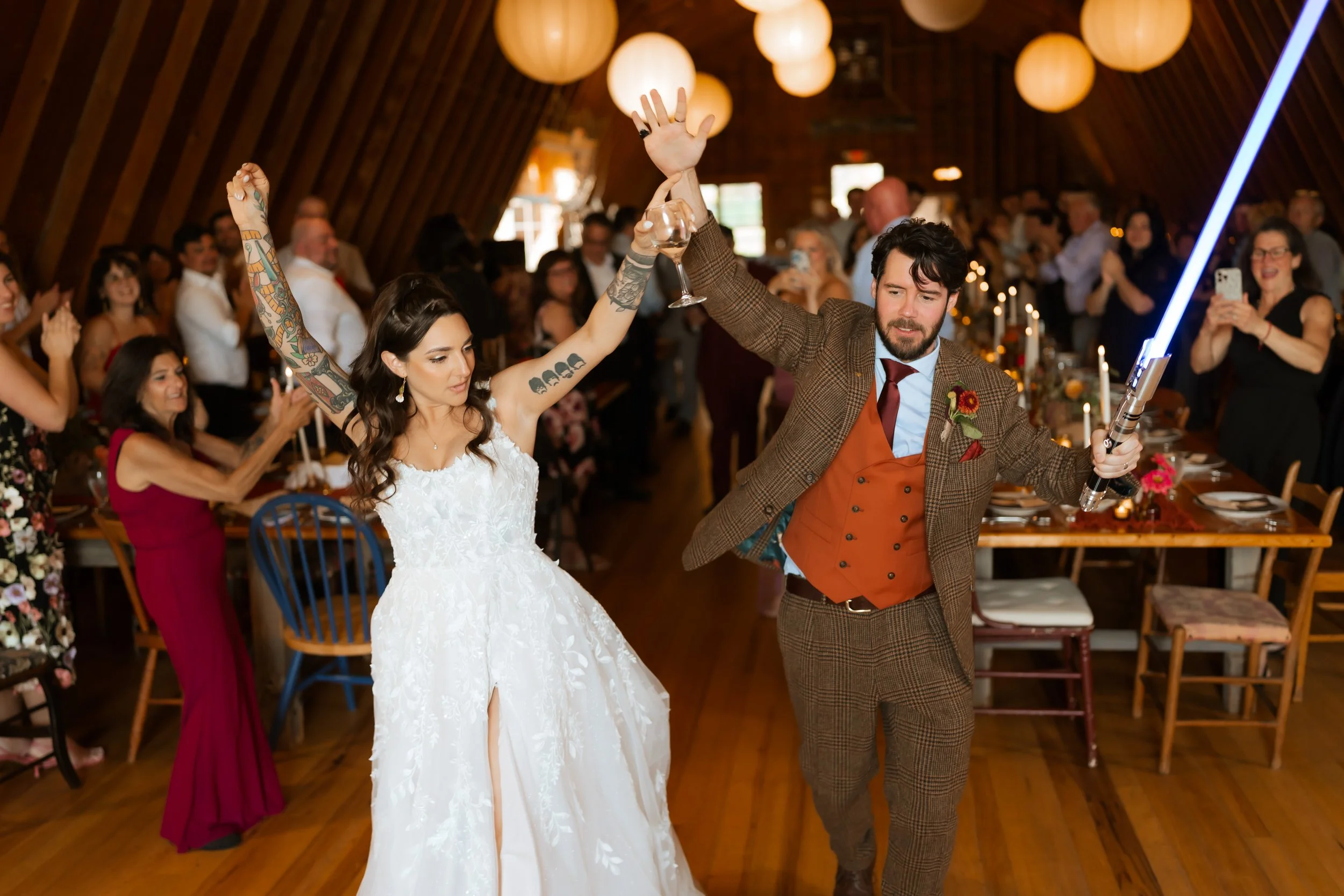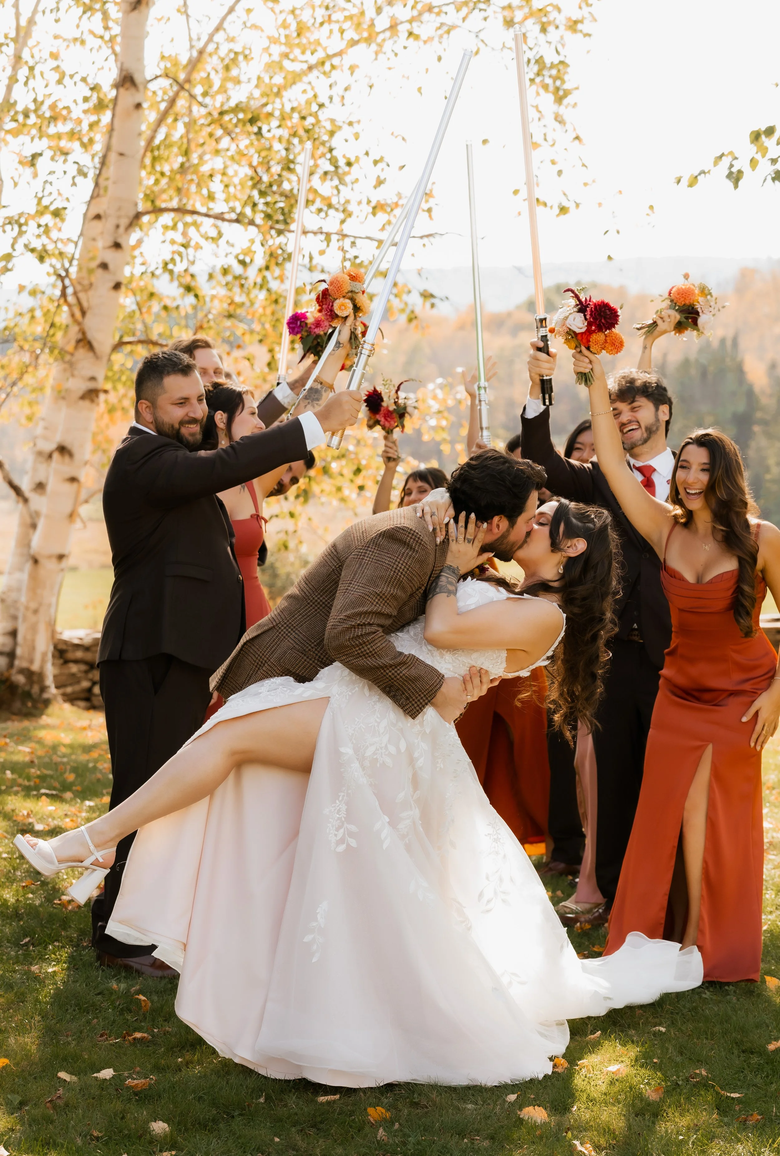 Later in the evening, just outside during the midst of party dancing, Amanda and Dalton surprised their guests with a moment no one saw coming. Leaning fully into the groom’s signature light sabers, the two broke into a hilarious, sci-fi-inspired routine that felt straight out of a movie scene. Laughter and cheers echoed through the Catskills night, creating one of those spontaneous, unforgettable moments that perfectly captured the fun, energy, and joy of their Upstate New York wedding, be sure to watch the reel below.