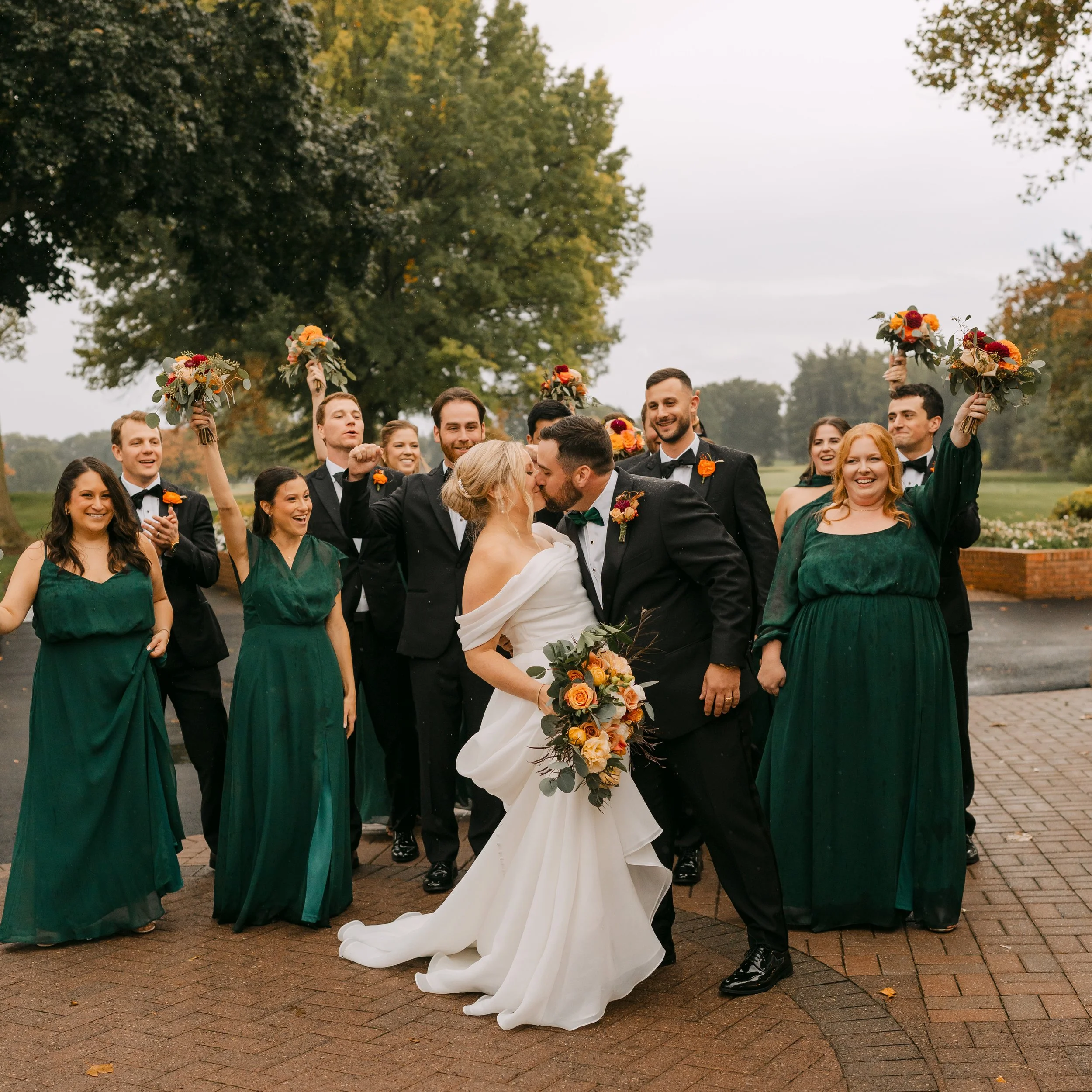 Cocktail hour at Monroe Golf Club embraced the misty weather rather than fighting it. Bridal party portraits during this time felt playful, romantic, and true to the day, with umbrellas, laughter, and movement replacing anything stiff or posed.