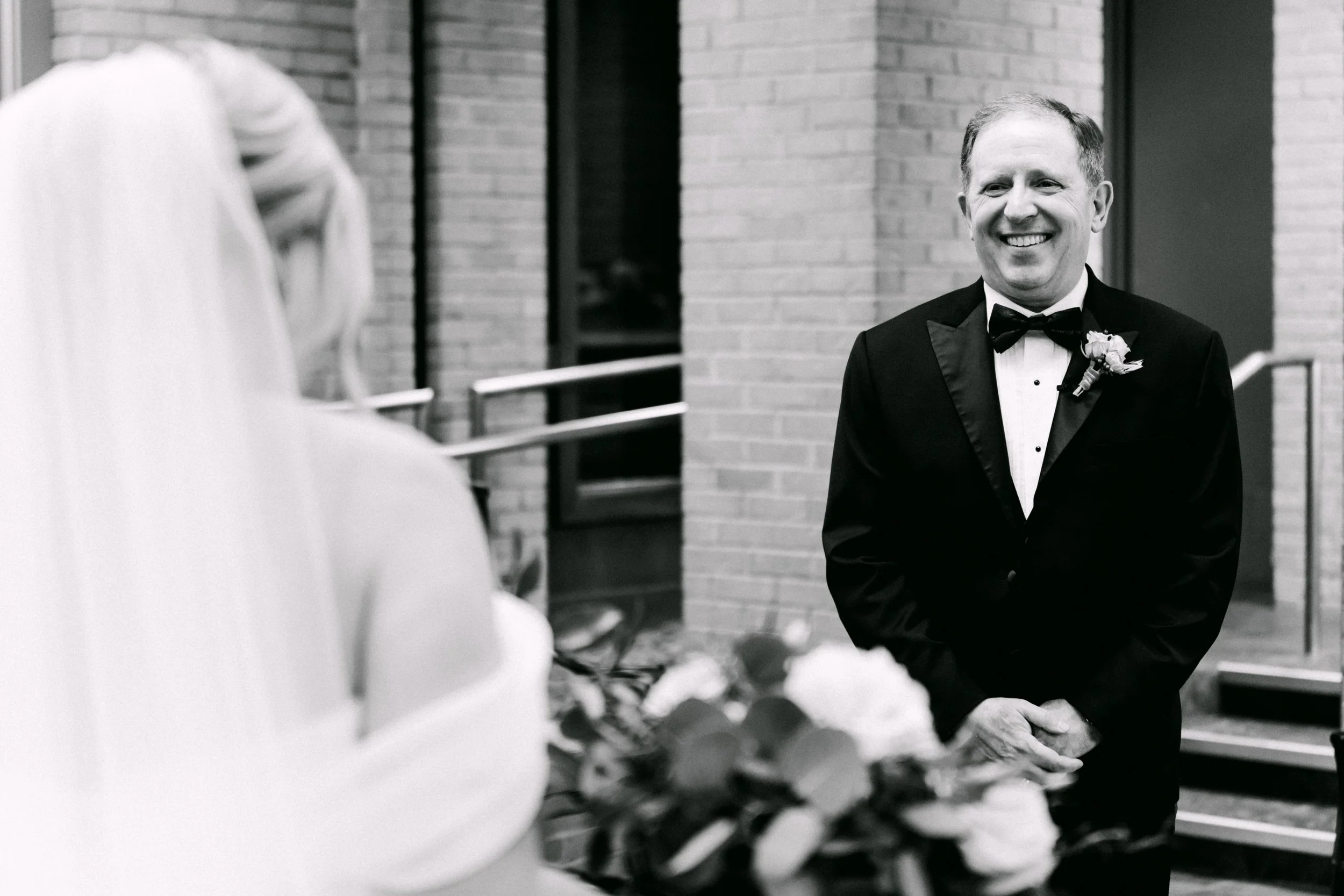 Following their portraits on the course, Elyse shared a second first look, this time with her father, Pat, at St. Louis Church, where he would later officiate their ceremony. That moment was quietly emotional and beautifully reverent, setting the tone for what was to come.